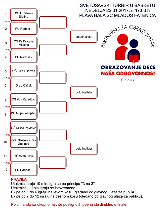 Удружење родитеља и наставника „Партнерски за образовање“ Чачак организује Светосавски турнир у баскету, у недељу 22. јануара 2017. године, у плавој хали СЦ „Младост“ у Атеници, од 17:00 до 20:00 часова.