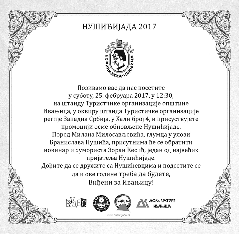 На Сајму туризма у Београду, у суботу, 25. фебруара 2017. у 12:30 на штанду Туристчике организације општине Ивањица, у оквиру штанда Туристичке организације регије Западна Србија, у Хали број 4, биће предтсављена и манифестација „Нушићијада“.