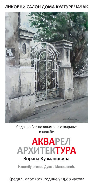 Изложба акварела Зорана Кузмановића, дипломираног инжењера архитектуре из Београда – АКВАРЕЛ АРХИТЕКТУРА, биће представљена у среду 1.марта у Ликовном салону Дома културе у 19:00 сати.