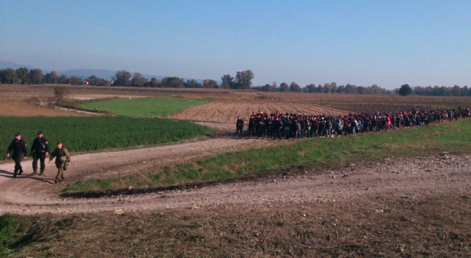 24. октобар 2015. Леп јесењи дан, лепа природа. Колона избеглица у пратњи војске и полиције утире свој пут до избегличког центра у Брежицама.